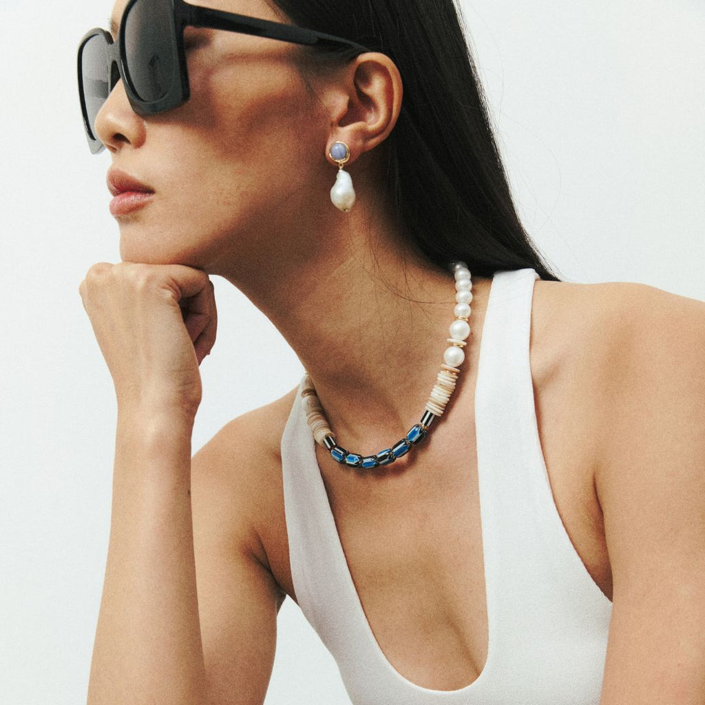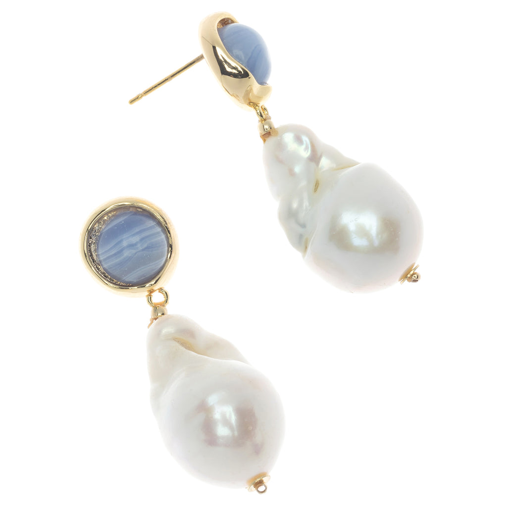 WHITE BAROQUE PEARL BLUE STUD EARRINGS