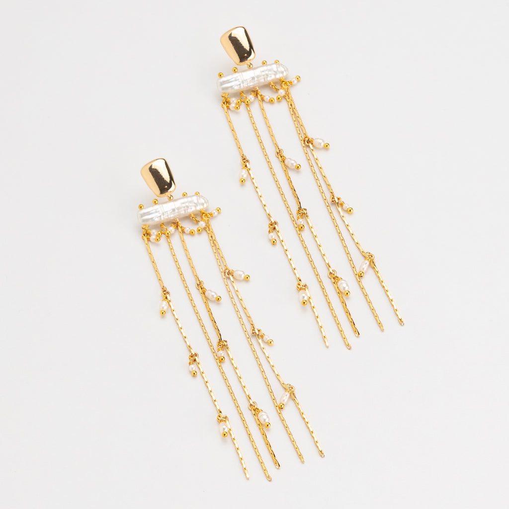WHITE PEARL GOLD CHAIN FRINGE EARRINGS