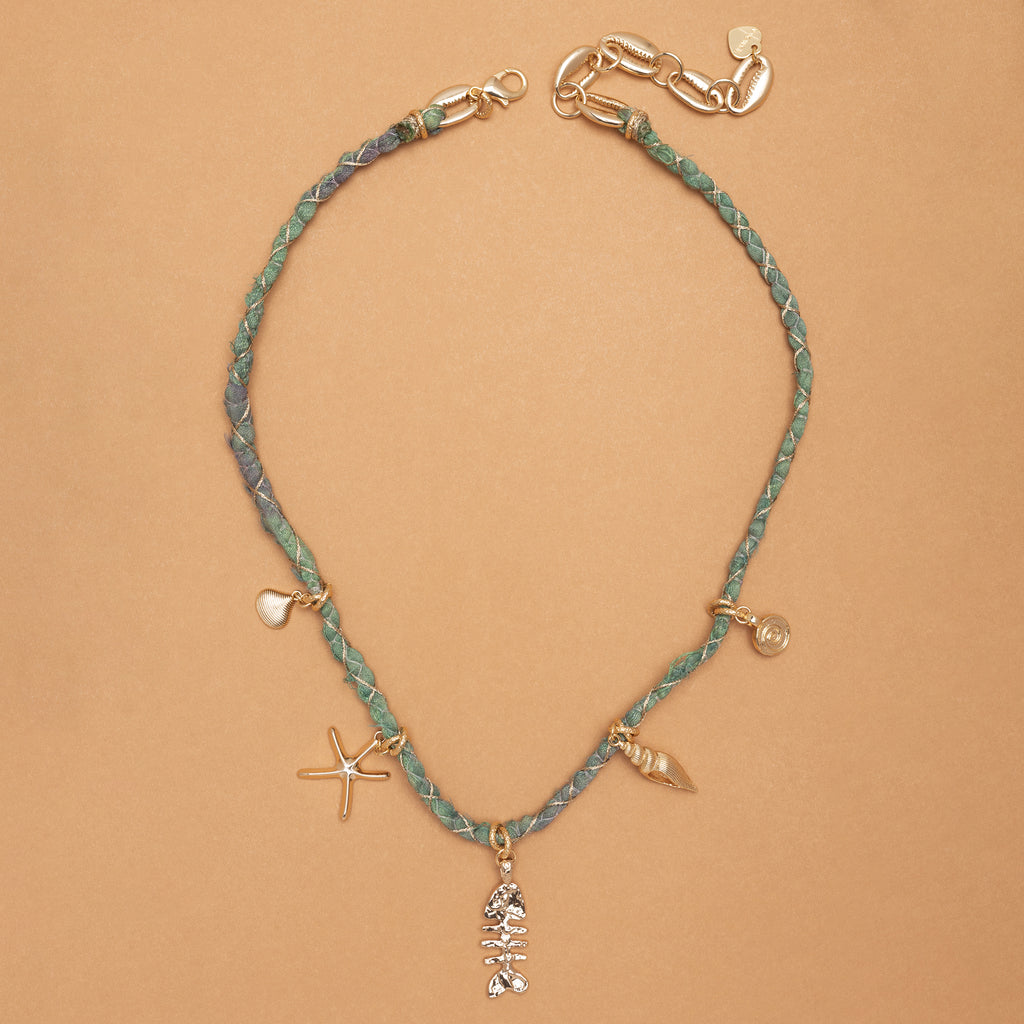 GOLDEN SEA CHARM TEAL BEADED NECKLACE