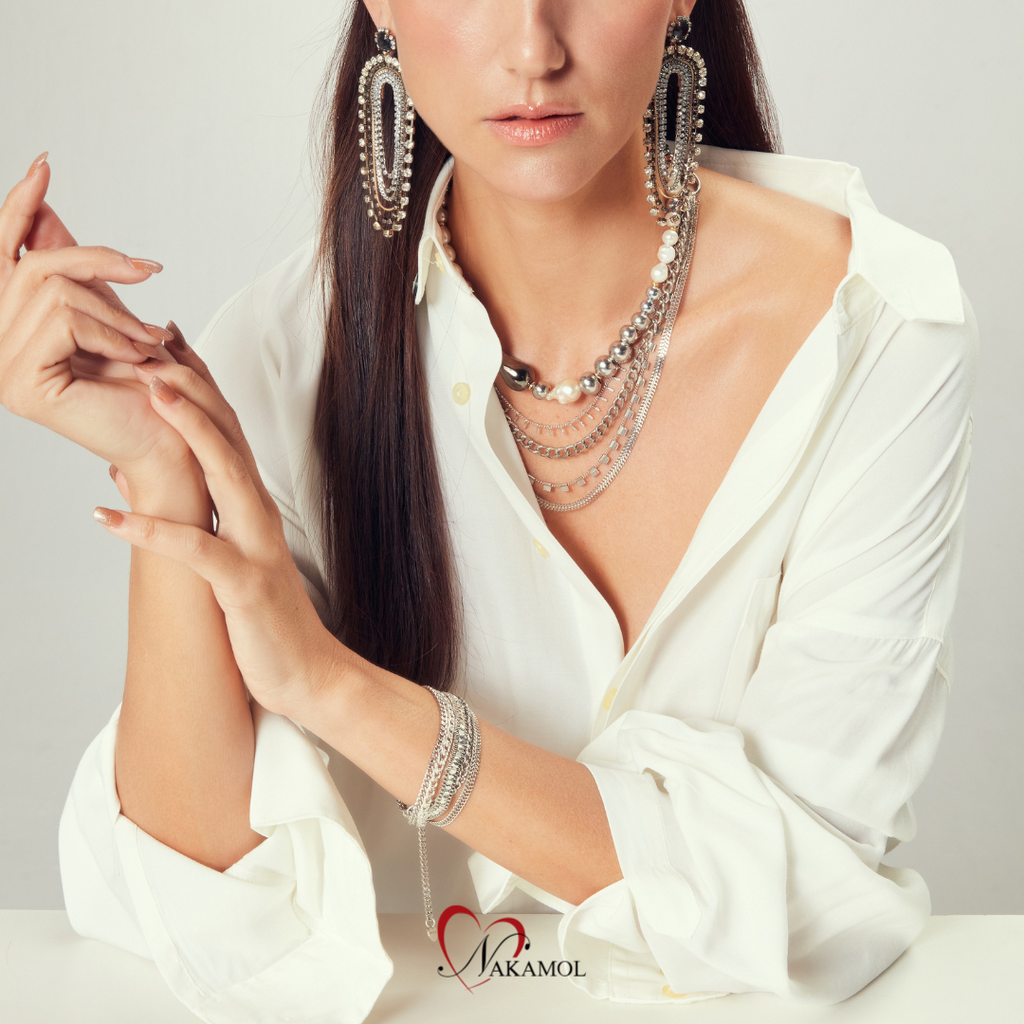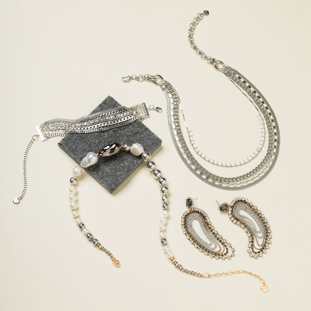 Silver Metal ชุดเครื่องประดับโลหะโซ่สีเงิน ดีไซน์เท่ ทันสมัย ผสมผสานไอเดียสร้างสรรค์ที่แตกต่างอย่างมีรสนิยมด้วยไข่มุกและเติมความหรูหราด้วยคริสตัลในจังหวะที่เหมาะสมลงตัว ไม่ว่าจะใส่น้อยชิ้นในวันสบายๆ ก็ให้ลุคผู้หญิงเท่ ทะมัดทะแมง ทันสมัย แต่ยังสัมผัสได้ถึงความหรูหราแต่ผ่อนคลาย